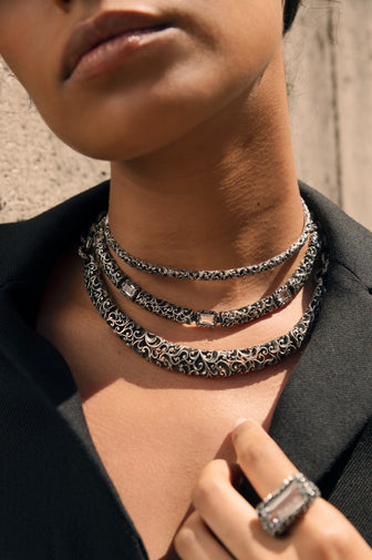 Leggerezza, mistero tra giochi di luce ed ombre. Creiamo ogni gioiello con passione grazie alla sapienza dei maestri orafi italiani che conservano l'antica arte del bulino con cui incidono a mano le superfici d’argento. Leggerezza, mistero tra giochi di luce ed ombre.
