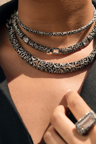 Leggerezza, mistero tra giochi di luce ed ombre. Creiamo ogni gioiello con passione grazie alla sapienza dei maestri orafi italiani che conservano l'antica arte del bulino con cui incidono a mano le superfici d’argento. Leggerezza, mistero tra giochi di luce ed ombre.
